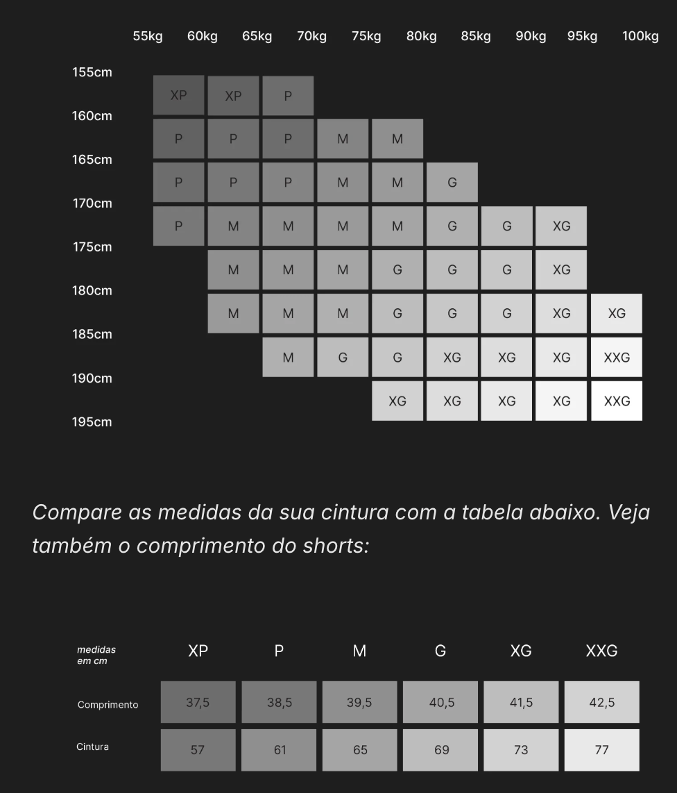Nossas peças são unisex e por isso temos uma grade de 5 tamanhos. A modelagem de nossas peças foram pensadas para ter um caimento confortável para todos.
